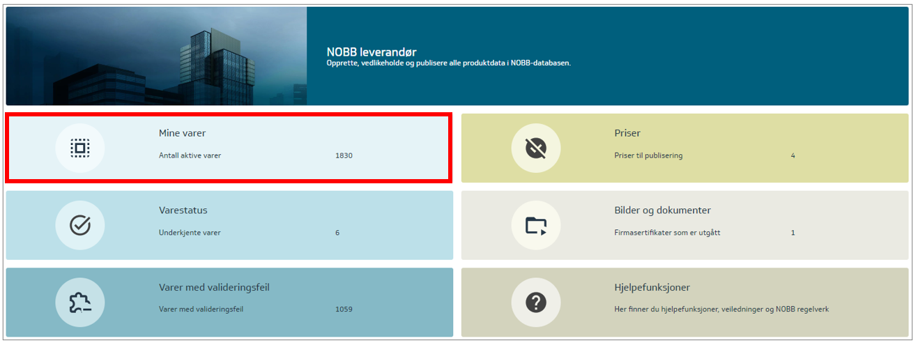 Boksen Mine varer viser antall aktive varer ditt firma har i NOBB.