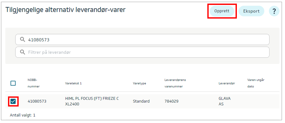 Finn og marker varen du ønsker å være alternativ leverandør for og trykk på knappen Opprett.