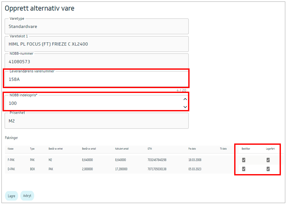 Legg inn Leverandørens varenummer, NOBB indekspris og velg Bestillbar/Lagerført på alle pakningene: