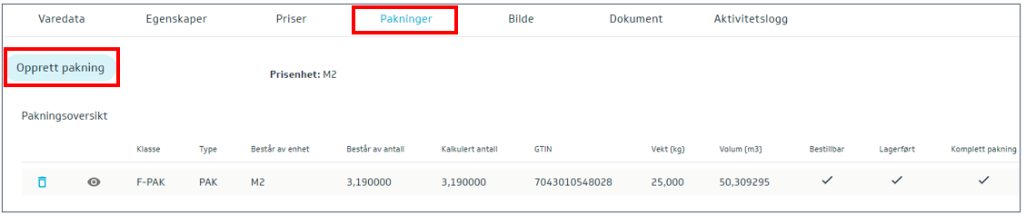 Trykk på Pakninger på varen og velg Opprett pakning: