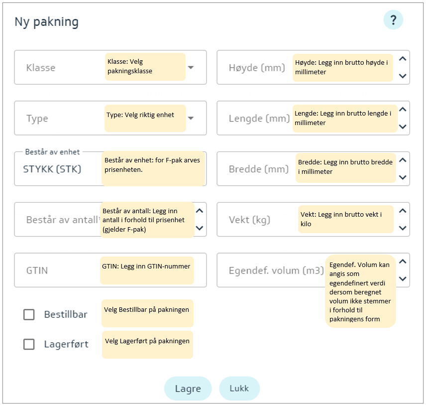 NB! Pakningens vekt må minimum være vekten til pakningen den består av multiplisert med verdi i feltet består av antall.
