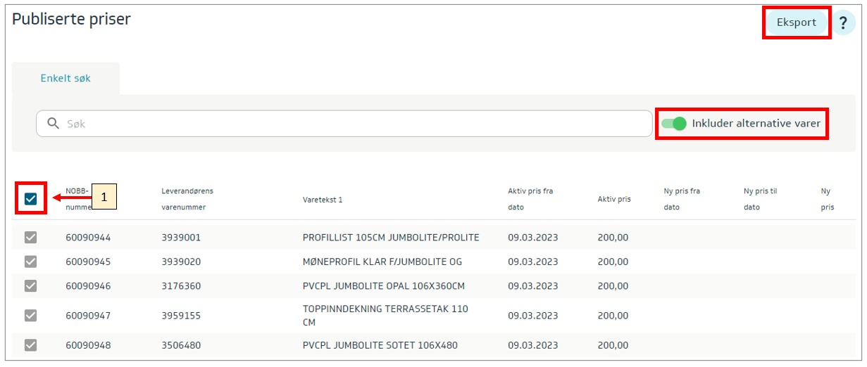Ønsker du å eksportere prisene, marker alle varene (1) og trykk på Eksport. Denne filen kan ikke benyttes til pris-import. For pris-import, se mer her.