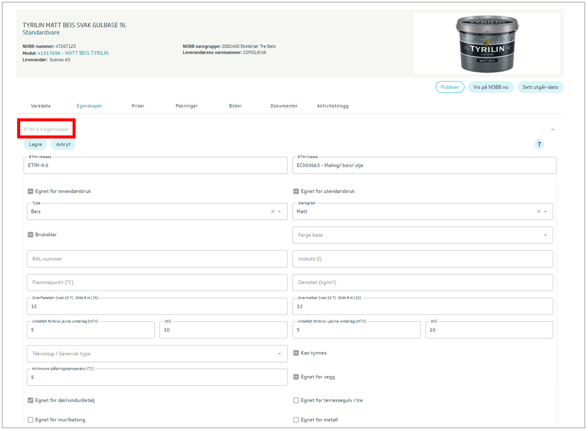 Ved visning av vare, under fanen Egenskaper – ETIM egenskaper, fremkommer det hvilken ETIM-versjon som er valgt av leverandøren. Ved å klikke Endre kan man legge til egenskapsverdier manuelt i grensesnittet. Klikk deretter lagre.