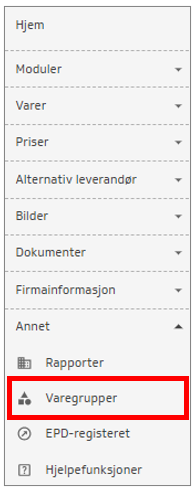 Her finner du oversikt over varegruppestruktur. Det er ikke mulig å eksportere strukturen til Excel.
