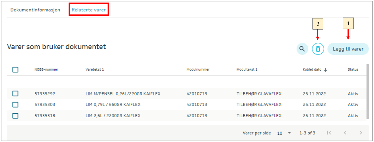 Her kan man koble vare til dokument / fil (1) eller slette dokument / fil fra vare (2):