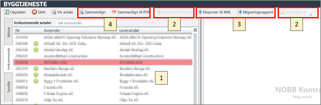 Det er laget en «Migreringsrapport» pr avtale som kan lastes ned og det er mulig å eksporter innkommende avtale til «Eksportere til XML»(3).